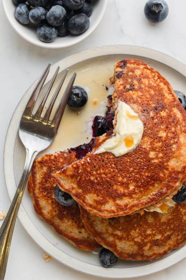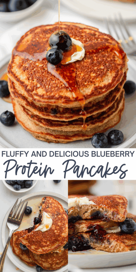 Blueberry protein pancakes are so easy to make and they come out perfectly light, fluffy and delicious every time! Theses pancakes are packed with protein and fiber and they make the BEST healthy breakfast to start your day off right! Gluten free, refined sugar-free, low-fat and low-carb.