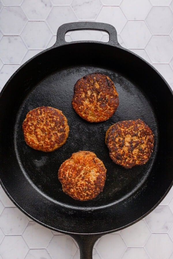 - Cook the burgers. Heat up a cast iron grill pan or heavy bottomed pan to medium heat and brush it with a little bit of olive oil. Once the pan is hot, add the burgers in an even layer. I was able to fit all four of the burgers nicely in my 10-inch pan but if you cannot fit all of them then just cook them in batches. Cook the burgers for 3-4 minutes on each side until the internal temperature reaches 165 degrees F. You can use a meat thermometer to check the temperature of the meat if you have one.