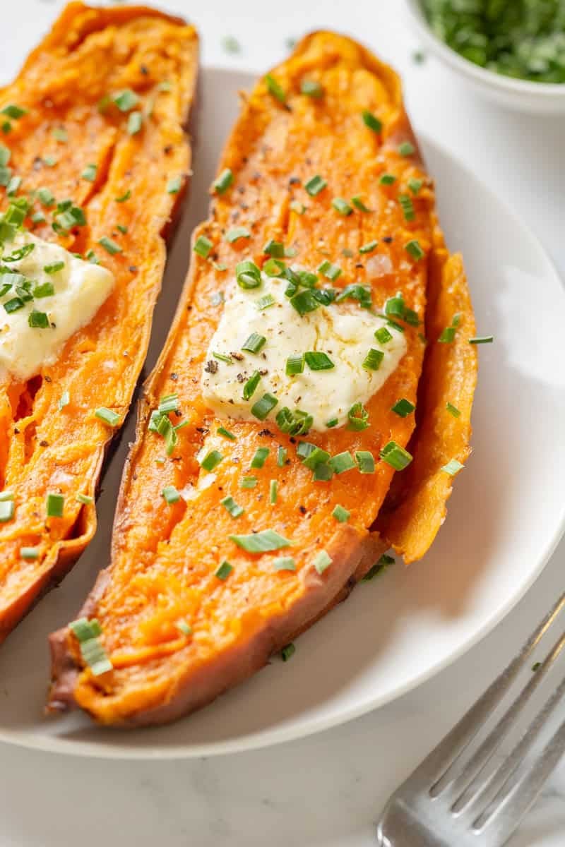 5. Carefully remove the sweet potatoes from the Instant Pot. Slice each, top with butter and chives.