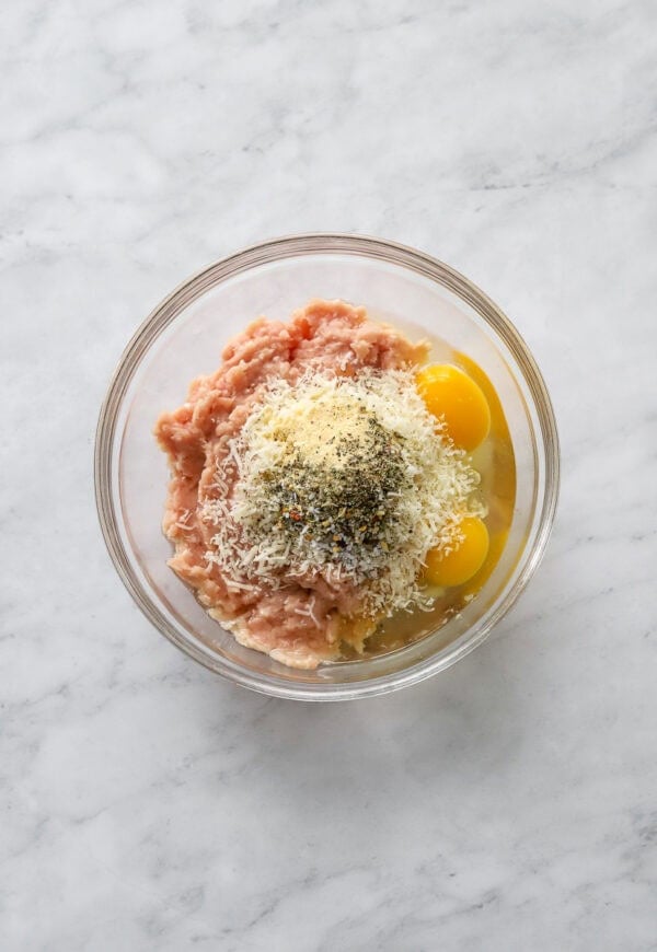 - Combine the ground chicken, eggs, cheese, seasoning salt and pepper in a large mixing bowl.
