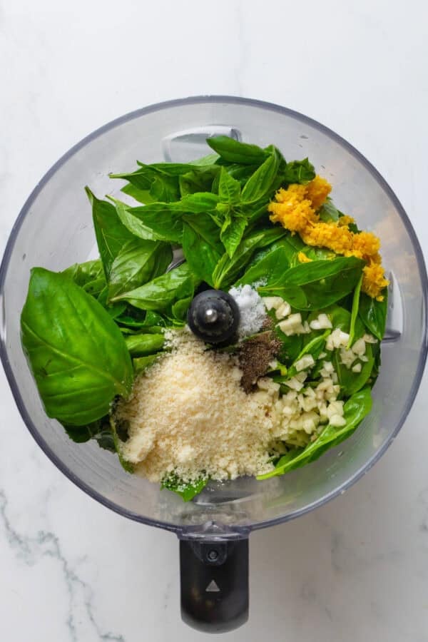 - Add fresh basil, garlic, lemon, parmesan cheese, salt and pepper to a food processor and pulse while streaming in the olive oil.