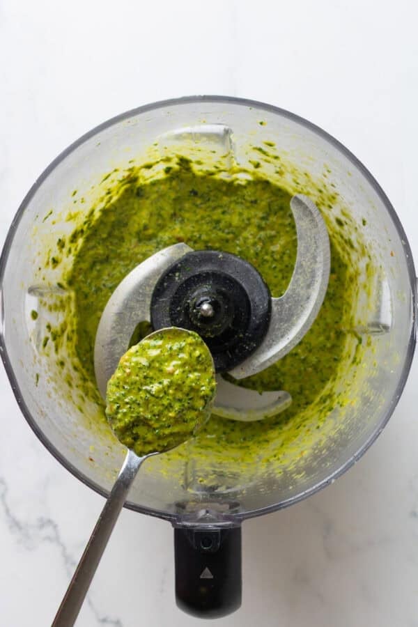 - Blend the pesto first then add in the nuts for a slight chunkier pesto