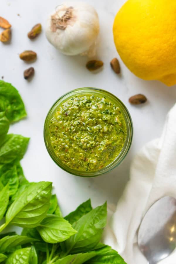 You can make this homemade pesto recipe in about 5 minutes for a flavor packed, chunky pesto to use on pasta, chicken or pizza! It is made with fresh basil leaves, parmesan, olive oil, garlic, lemon and pistachios and stores beautifully.