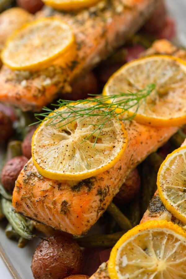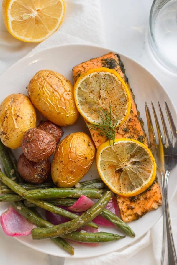 This Sheet Pan Salmon Dinner is a complete healthy meal all in one crazy good recipe. It is loaded with amazingly flavors like lemon, garlic and dill and can be made with ingredients you likely have in your kitchen, that is if you happen to have some fresh salmon.