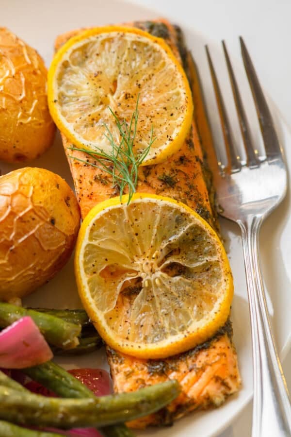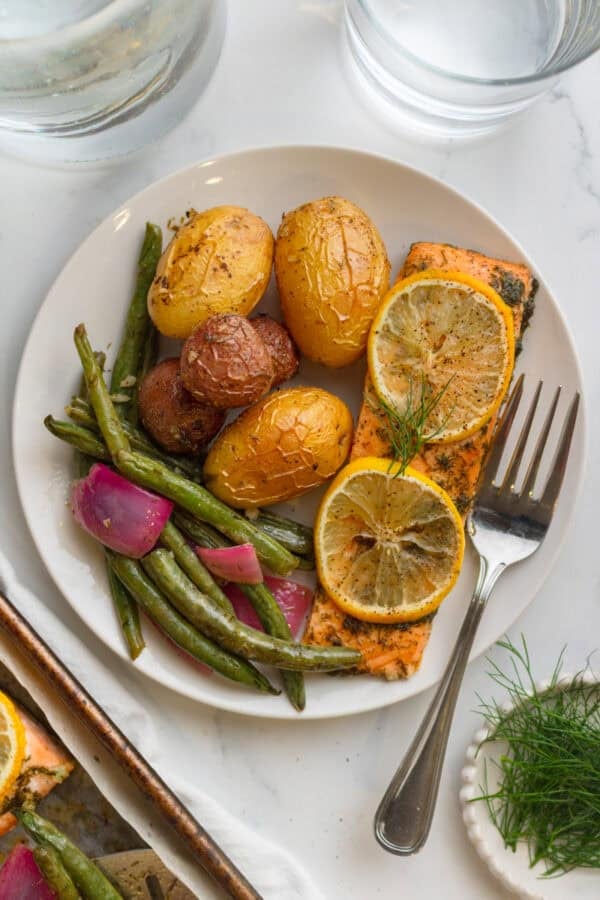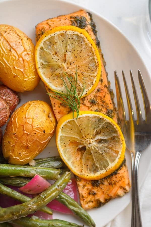 My husband went crazy over this salmon recipe and I equally loved it! The flavors are wonderful and the Salmon cooks so perfectly along with all of the colorful veggies. In this recipe, I used crisp green beans, baby potatoes, and baby pearl onions, which added a nice pop of color to the whole meal.