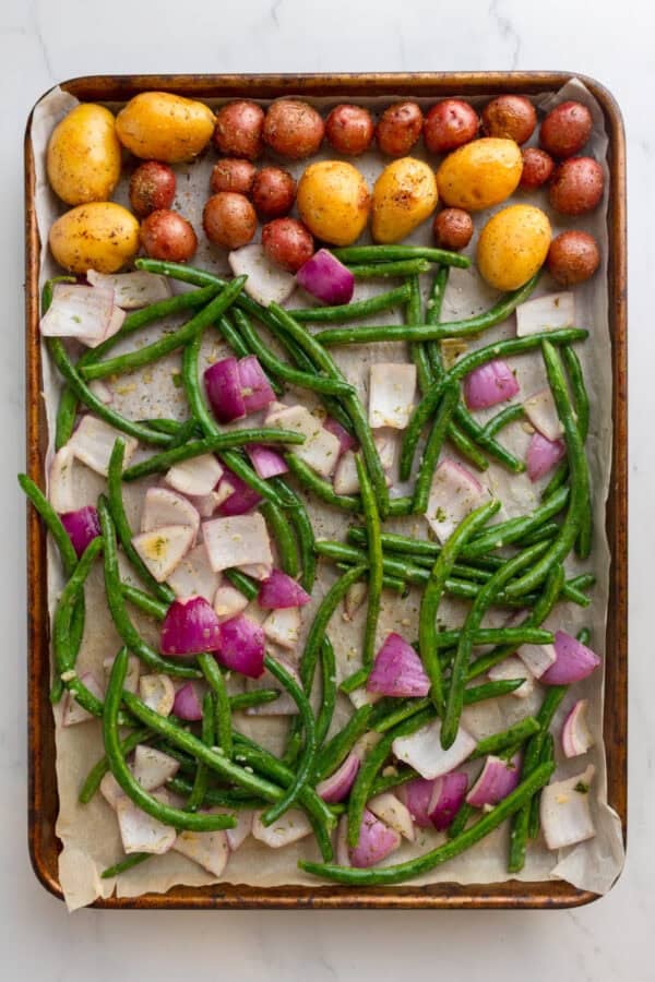 - Toss green beans and onion with the reserved marinade, then spread them on the baking sheet next to the potatoes. Return pan to oven and bake for 5 minutes.