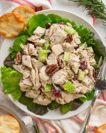- Healthy snack – scoop a big helping of this chicken salad onto a plate and enjoy it with some crackers like Mary’s crackers, cucumber, bell pepper, carrots, or sliced radishes.