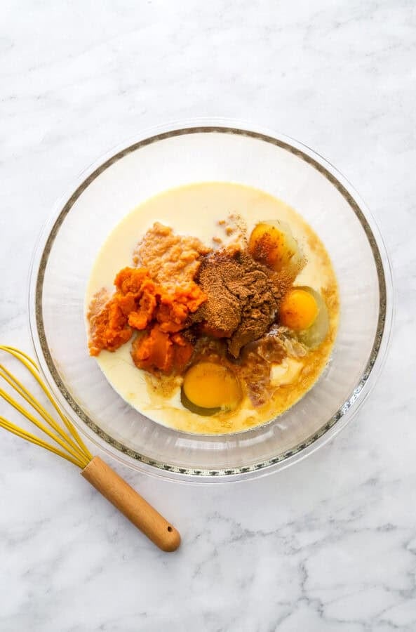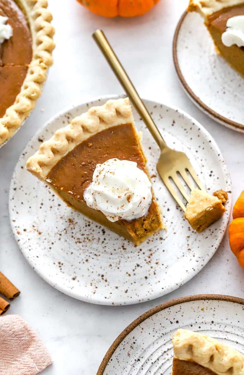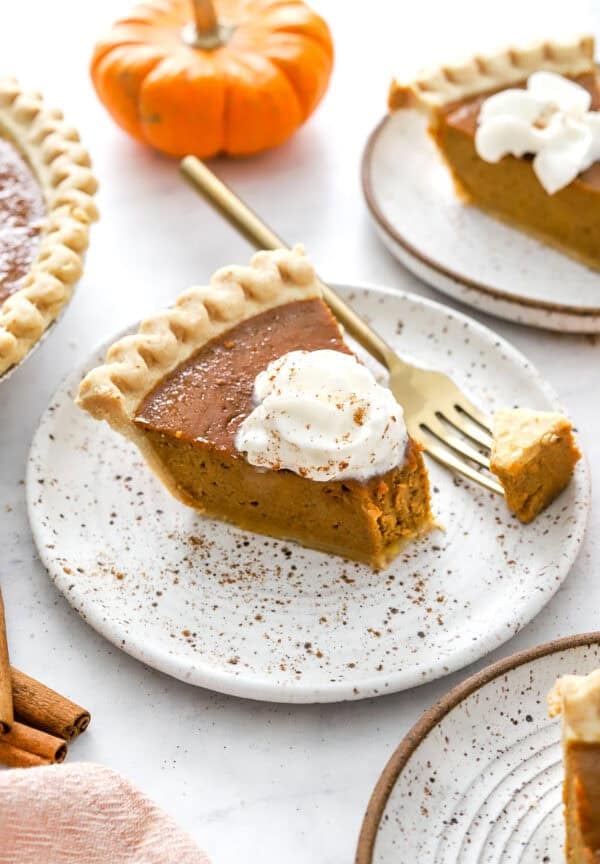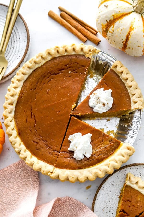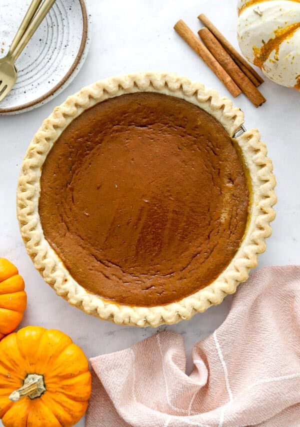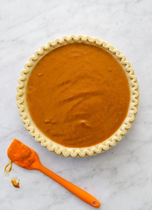 You can easily make this pumpkin pie ahead of time and store it covered in the fridge for up to 2 days before you serve it. You can also make and store the pumpkin pie filling in an airtight container in the fridge for up to 2 days before you make the pie.