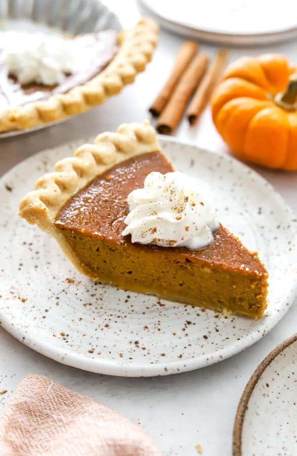 You can easily make this pumpkin pie ahead of time and store it covered in the fridge for up to 2 days before you serve it. You can also make and store the pumpkin pie filling in an airtight container in the fridge for up to 2 days before you make the pie.