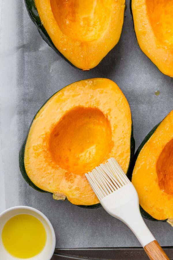 - Season – brush each half of the squash with olive oil and sprinkle each with some salt for extra flavor.