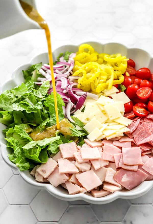 Chopped deli meats and cheese, lettuce, tomatoes, peppers and onion in a large salad bowl topped with dressing.