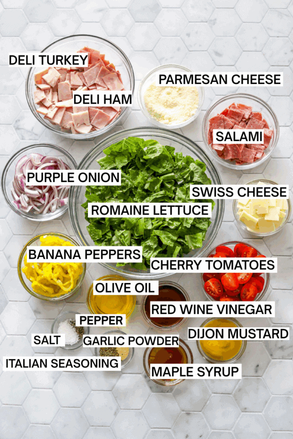Ingredients for a grinder salad in bowls with labels over each ingredient.