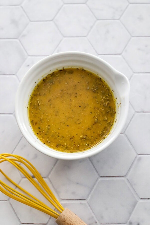 Grinder salad dressing in a white bowl with a yellow whisk in front of it.