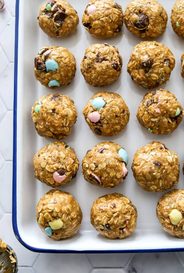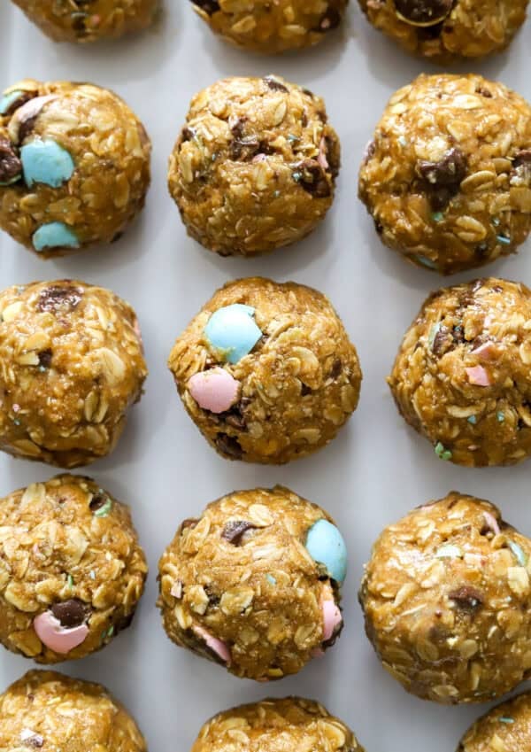 These Mini Cadbury Egg Protein Balls are the best no-bake Easter treat! They are made with oats, protein powder, maple syrup, peanut butter and festive Easter chocolate candies for a fun, healthy dessert that you can make and enjoy all week long!