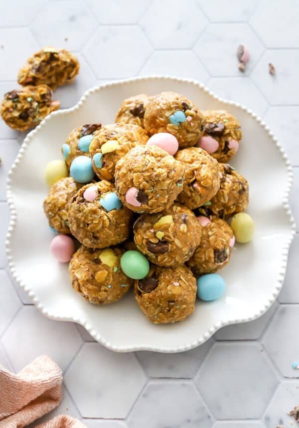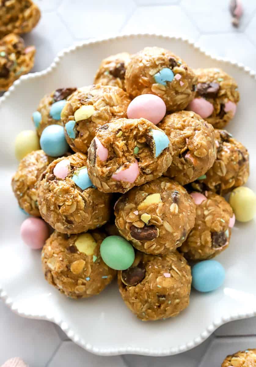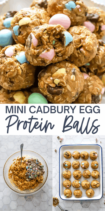 After seeing the mini cadburg egg recipes all over social media, I had to make a version I could enjoy. Of course, in true PMG fashion I decided on no-bake mini cadbury egg protein balls (a family favorite). I took my basic protein balls recipe I used for these monster cookie energy bites and added in chopped mini cadbury eggs, for the BEST Easter sweet treat!