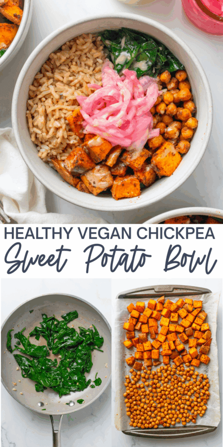 I love buddha bowls and this chickpea buddha bowl is my new favorite! This on is made with perfectly roasted sweet potatoes and chickpeas nestled next to fluffy brown rice and garlicky sautéed spinach. Then topped with pickled red onion and the most amazing tahini dressing.
