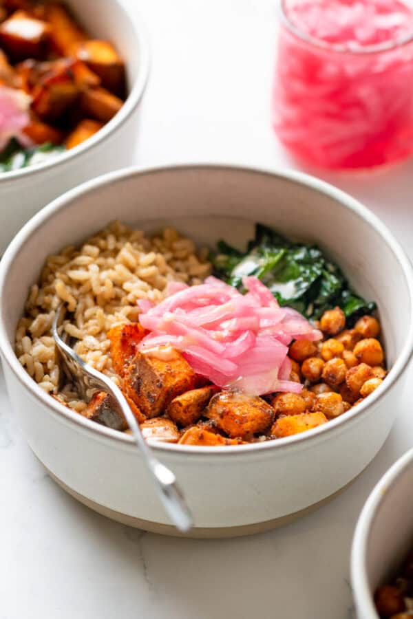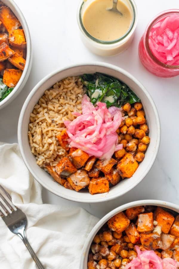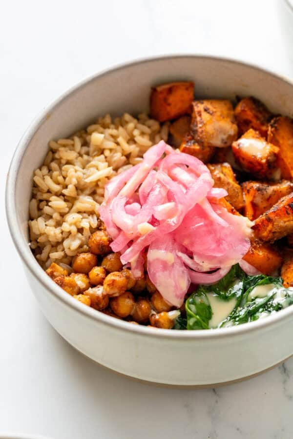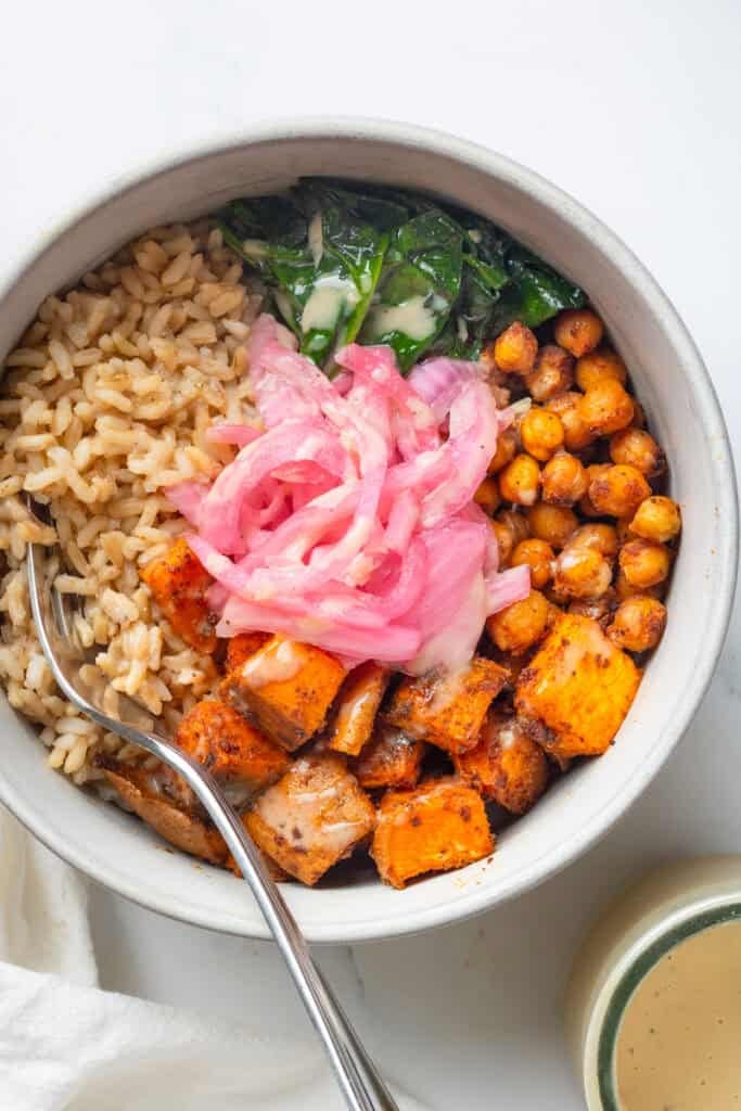 - Build your buddha bowl. Add some cooked rice to a round bowl. Spoon some of the roasted sweet potato, chickpeas and spinach around the rice in the bowl. Top with pickled red onion and a drizzle of the tahini dressing.