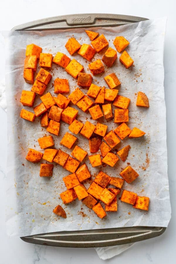 - Roast the sweet potatoes and chickpeas. Preheat the oven to 425 degrees F and line a baking sheet with parchment paper. Add the potatoes to the baking sheet, drizzel them with 1 tablespoon olive oil and toss. Combine the garlic powder, Chili Powder, salt and pepper in a small bowl. Sprinkle ½ of the seasoning over the potatoes and toss to coat them all. Place the potatoes into the preheated oven and cook for 15 minutes.