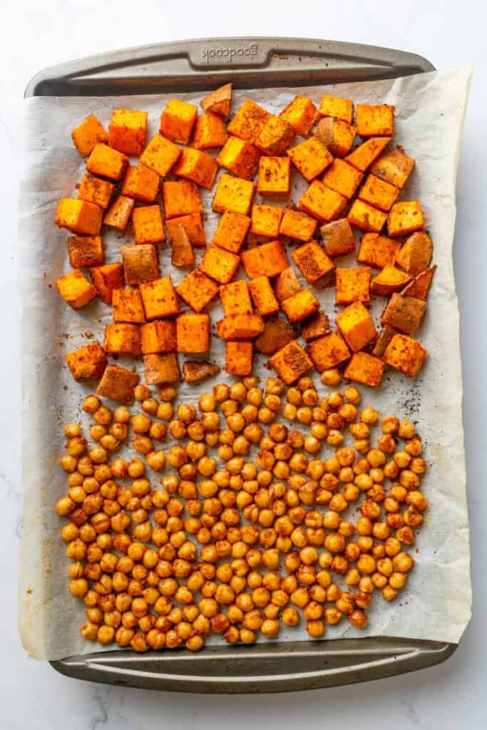 - Roast the sweet potatoes and chickpeas. Season the potatoes, add them to a baking sheet and roast them at 425 degrees F for 15 minutes. Add the chickpeas to the same pan, season them and toss, then continue roasting for 10-15 more minutes.