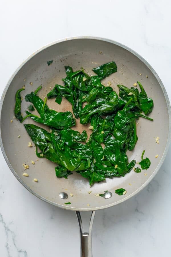 - Sauté the spinach. Heat a pan with oil to medium heat on the stovetop. Add the garlic and sauté for 1 minute. Add in the spinach and cook until wilted then season with salt and pepper. Set aside.